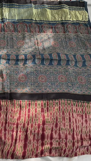 Ajrakh modal silk saree with Shibori on body rust maroon